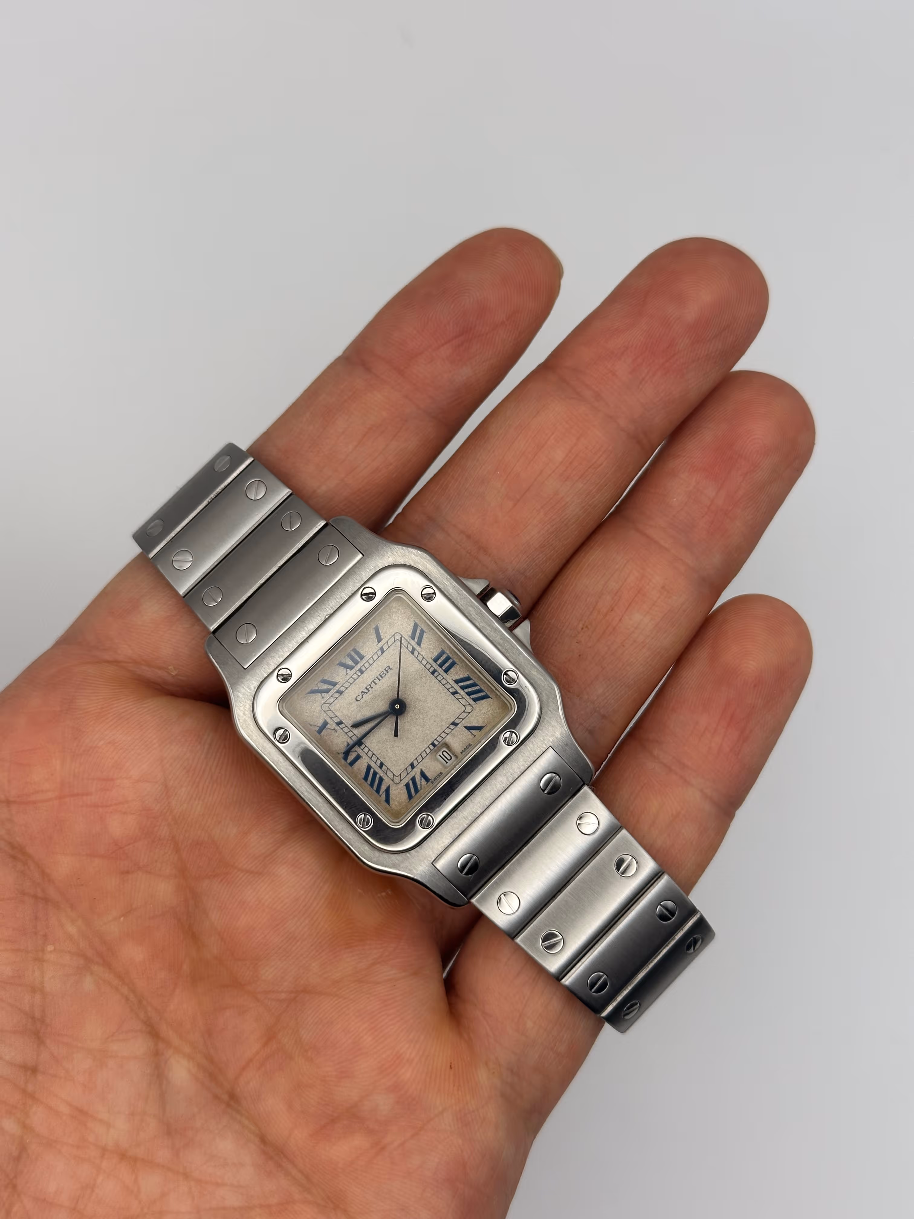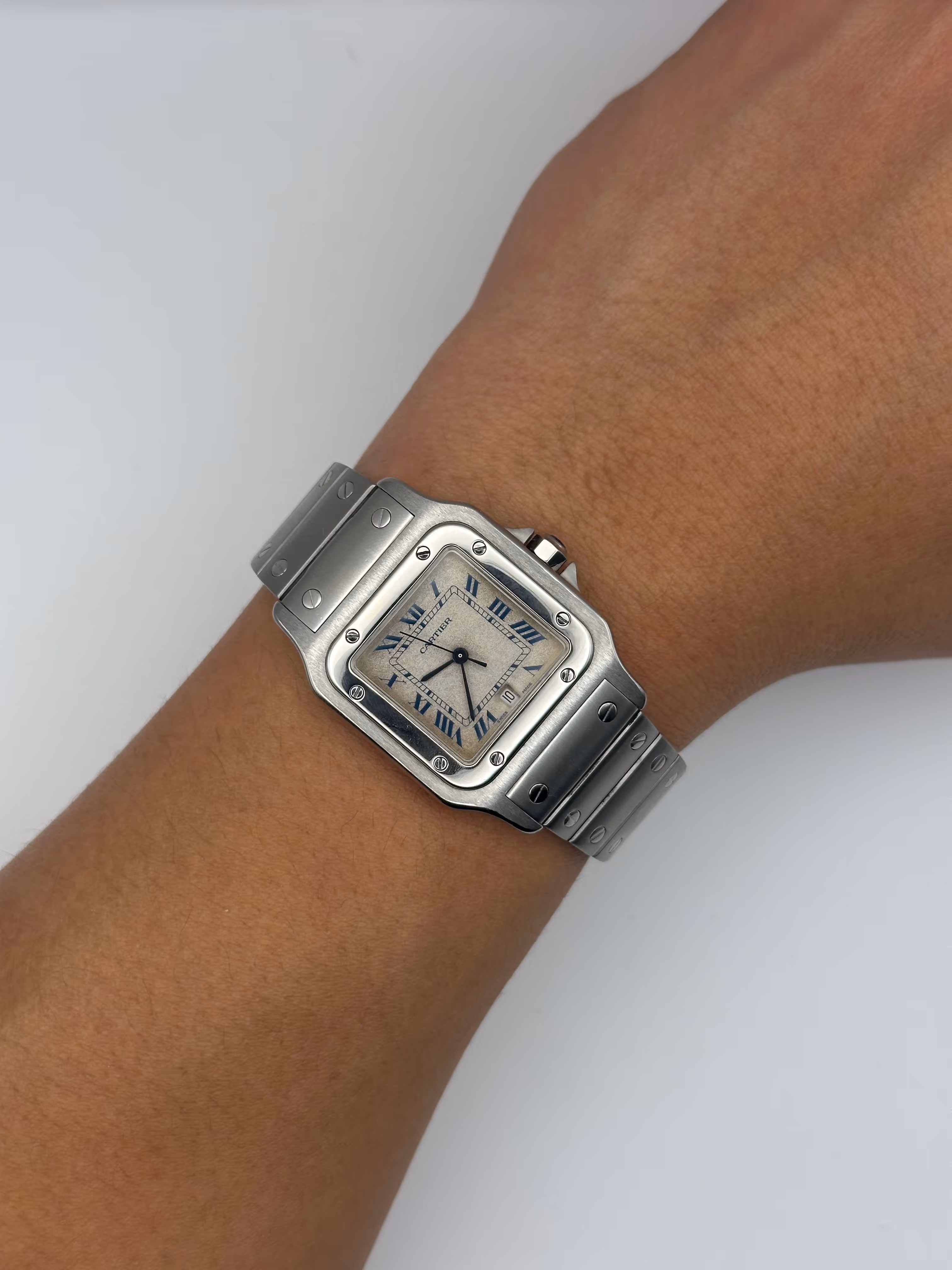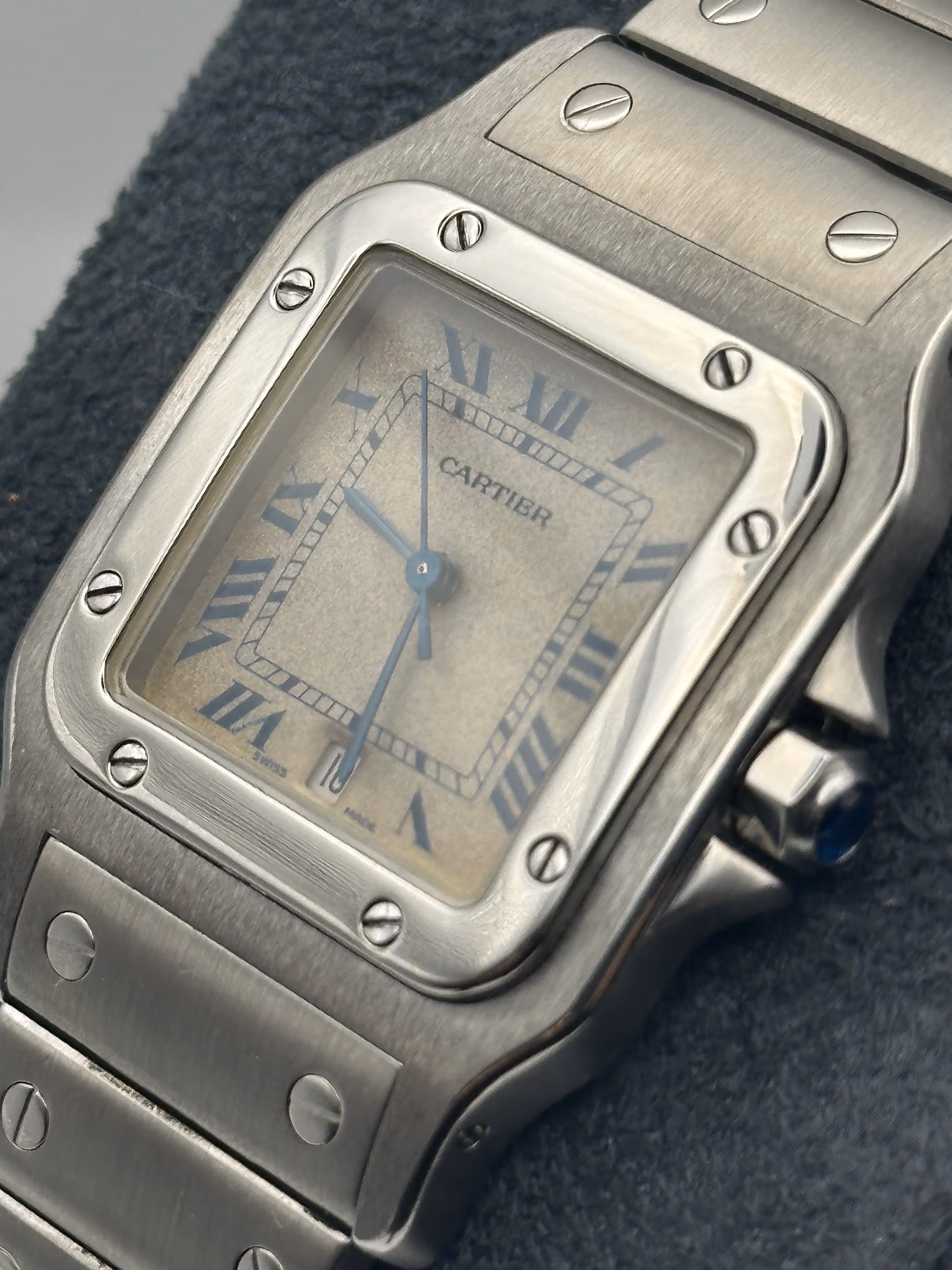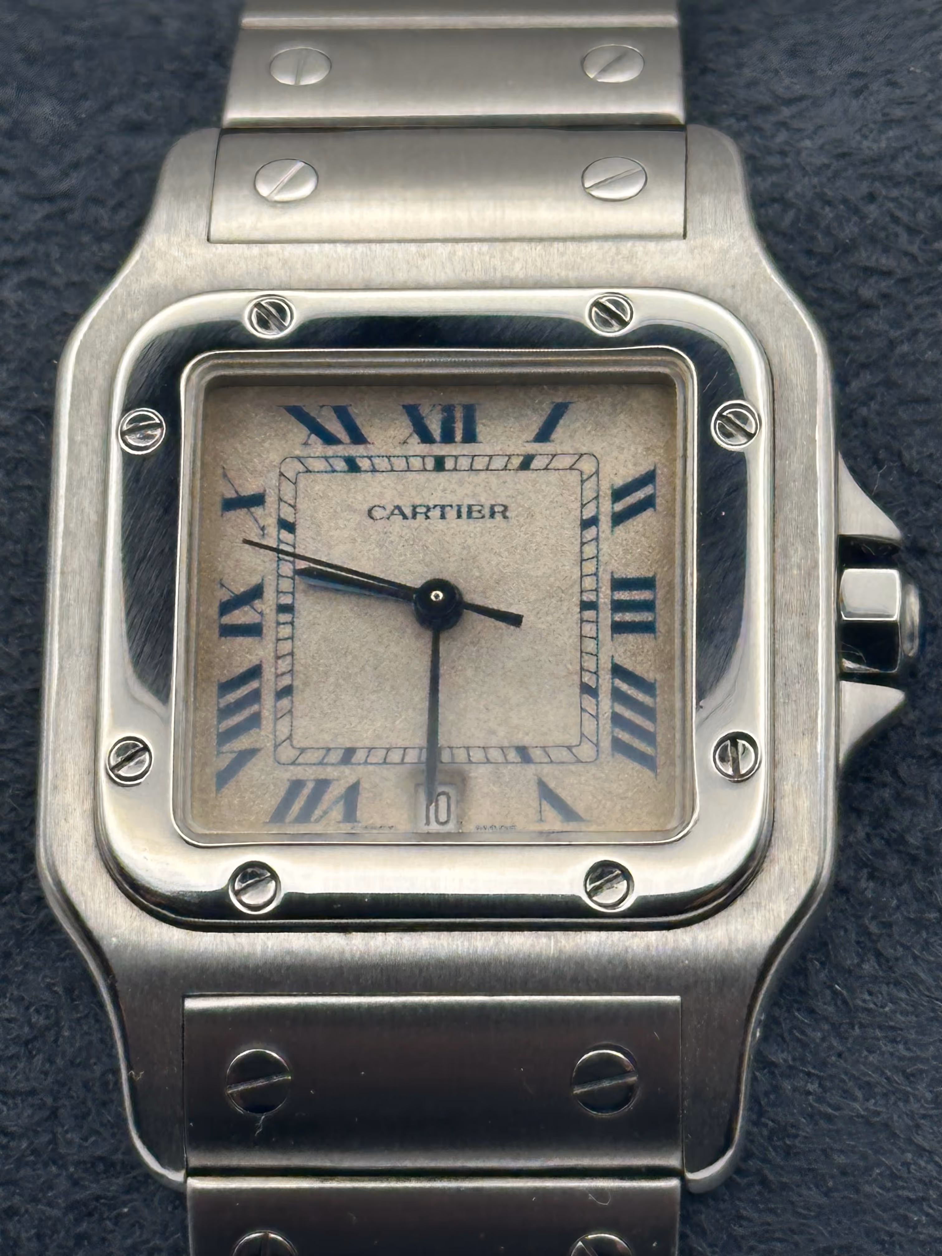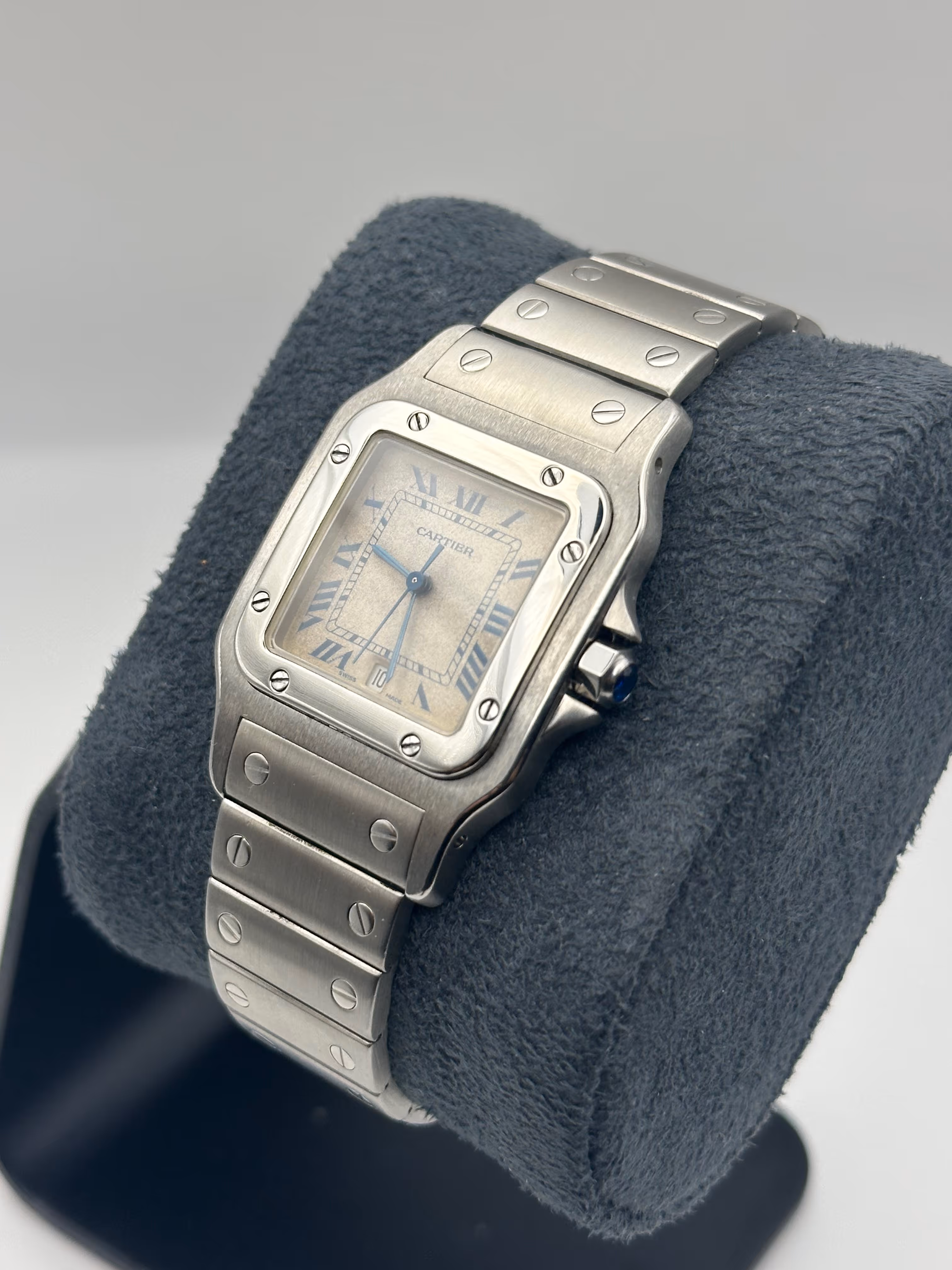 Cartier Santos Galbée référence 987901 en acier, boîtier 29 mm aux lignes emblématiques de la maison Cartier, animée par un mouvement quartz alliant fiabilité et confort d’usage quotidien. Cette pièce se distingue par son cadran patiné au charme authentique, sublimé par de superbes aiguilles bleuies apportant contraste et élégance. La montre a été révisée en avril 2026 et présente un boîtier poli, offrant une très belle présence au poignet. Elle est accompagnée de sa boîte ainsi que de ses papiers vierges, un ensemble recherché pour cette référence devenue incontournable de la collection Santos.
