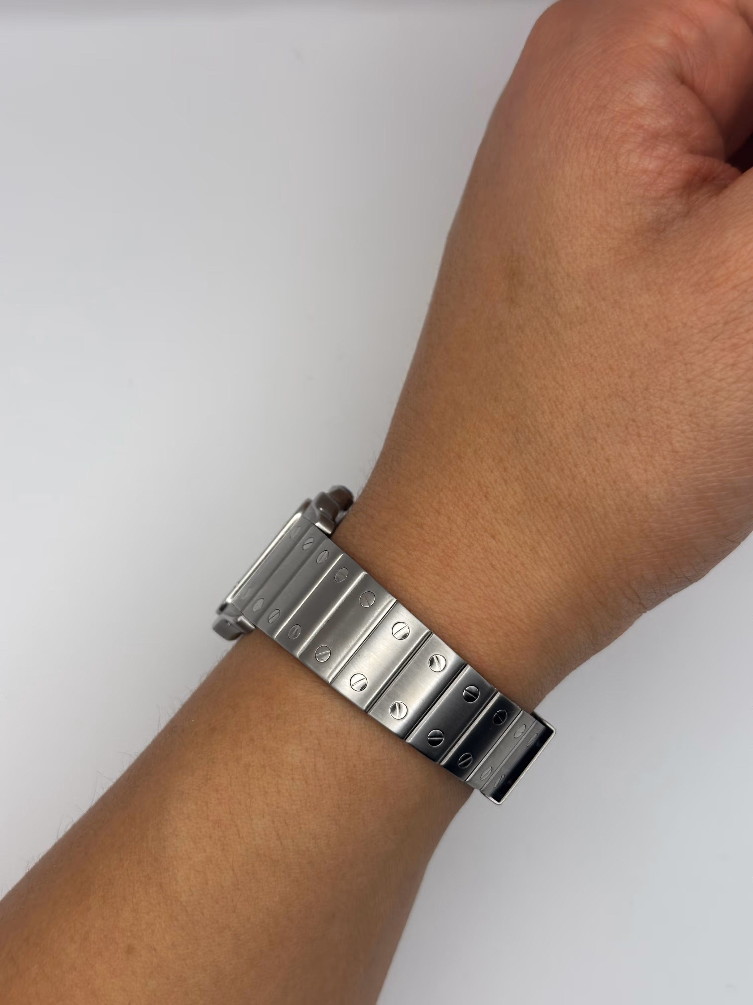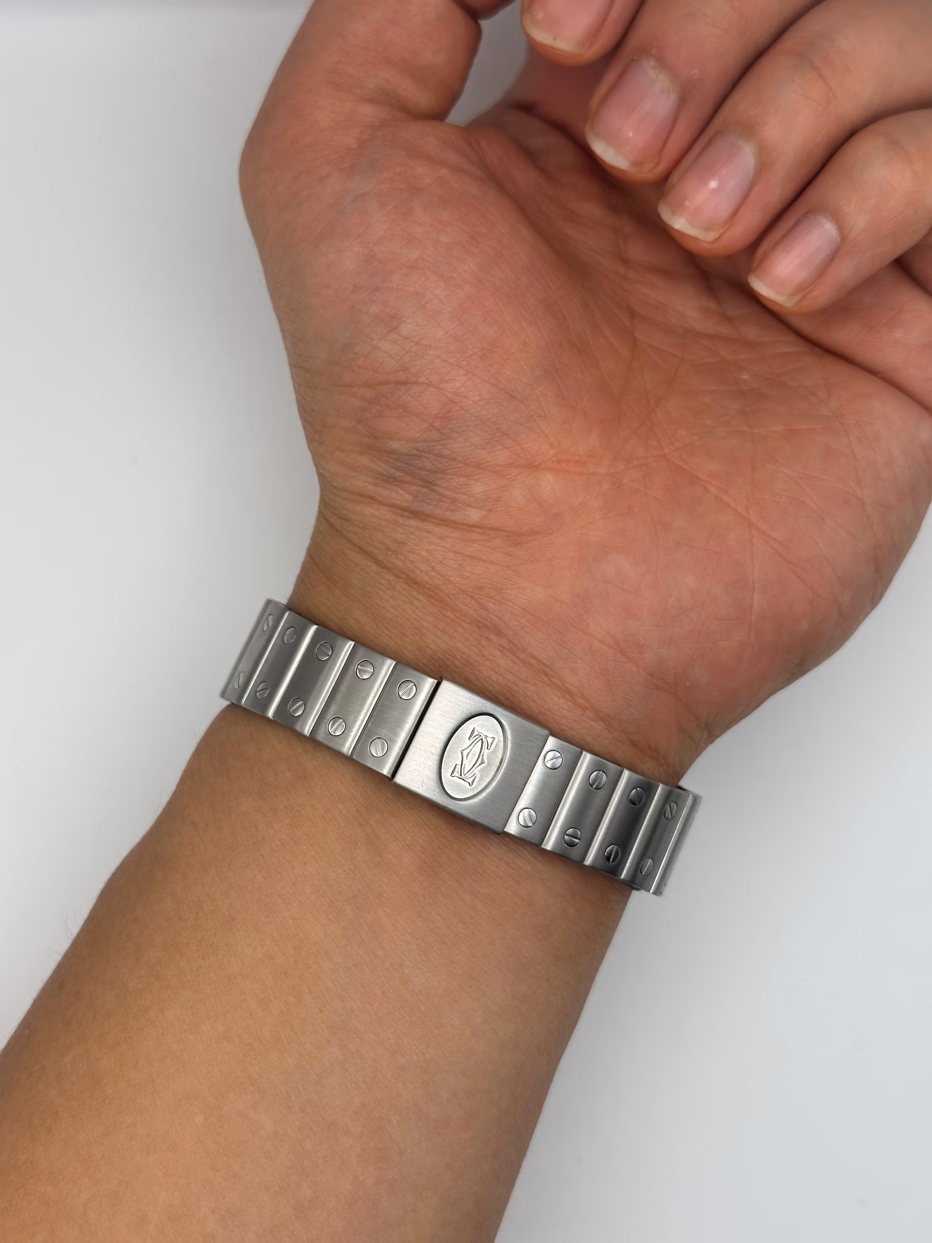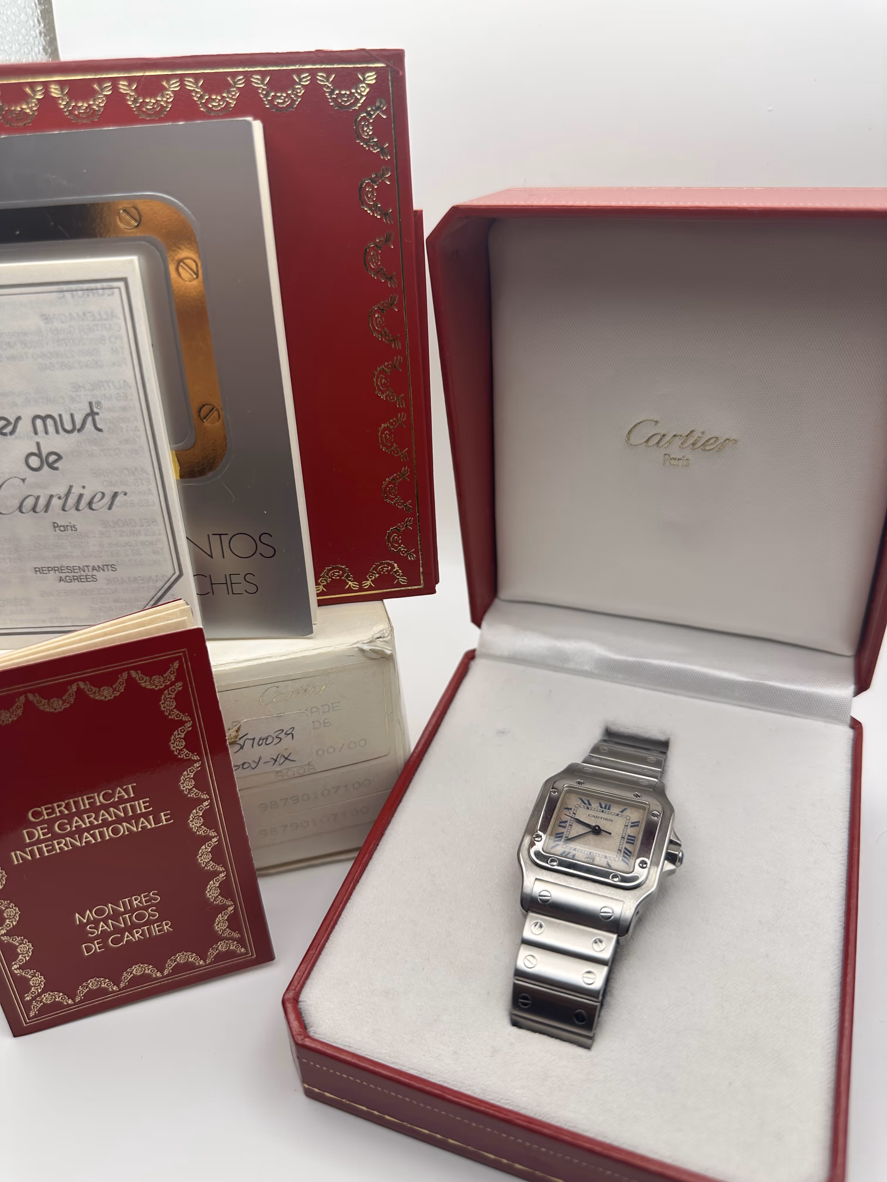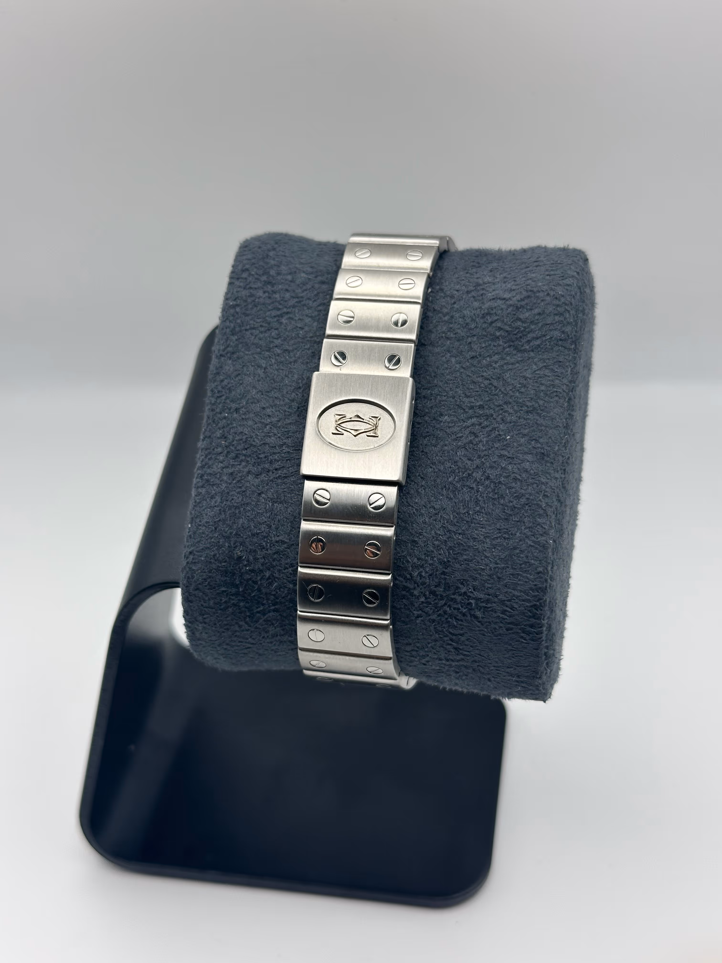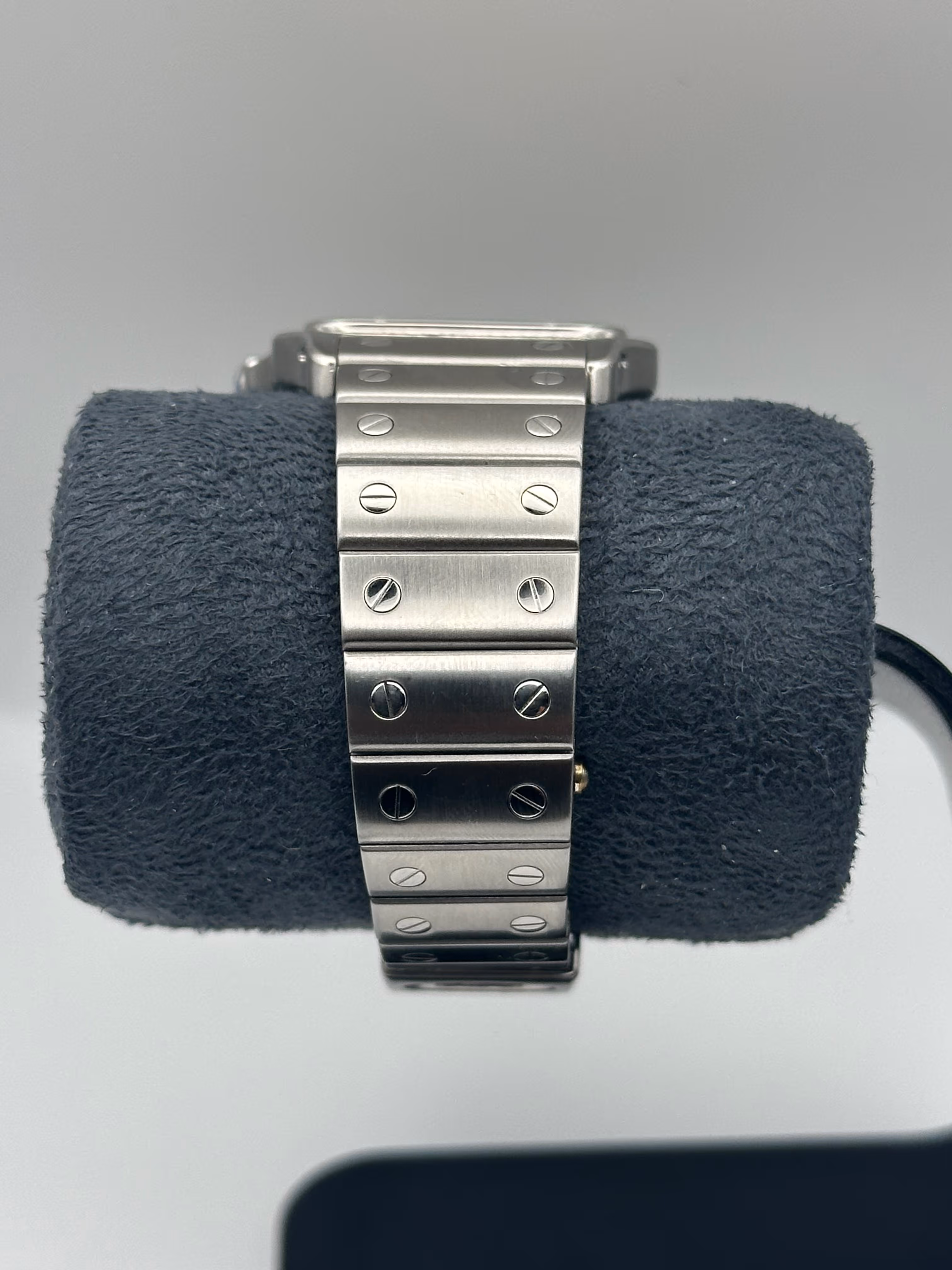 Cartier Santos Galbée référence 987901 en acier, boîtier 29 mm aux lignes emblématiques de la maison Cartier, animée par un mouvement quartz alliant fiabilité et confort d’usage quotidien. Cette pièce se distingue par son cadran patiné au charme authentique, sublimé par de superbes aiguilles bleuies apportant contraste et élégance. La montre a été révisée en avril 2026 et présente un boîtier poli, offrant une très belle présence au poignet. Elle est accompagnée de sa boîte ainsi que de ses papiers vierges, un ensemble recherché pour cette référence devenue incontournable de la collection Santos.