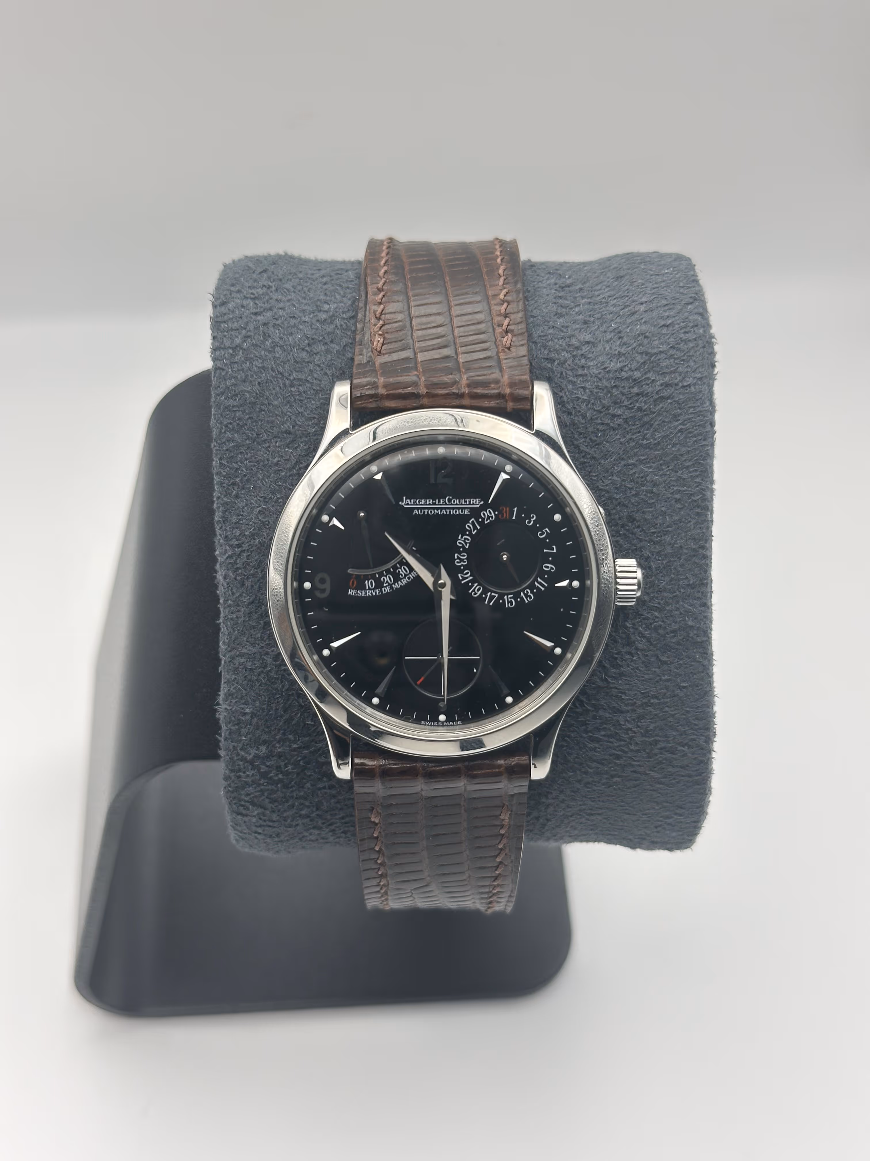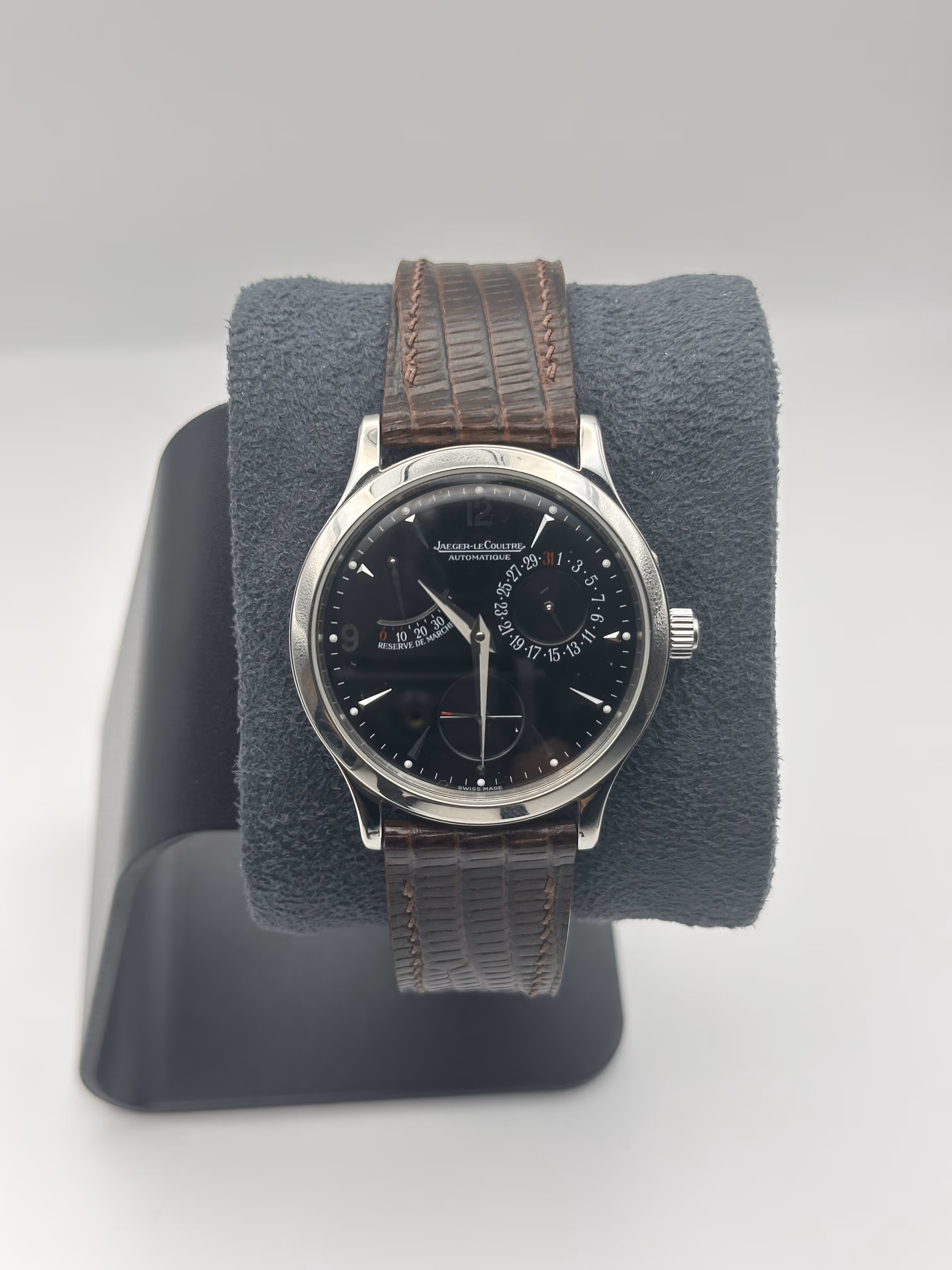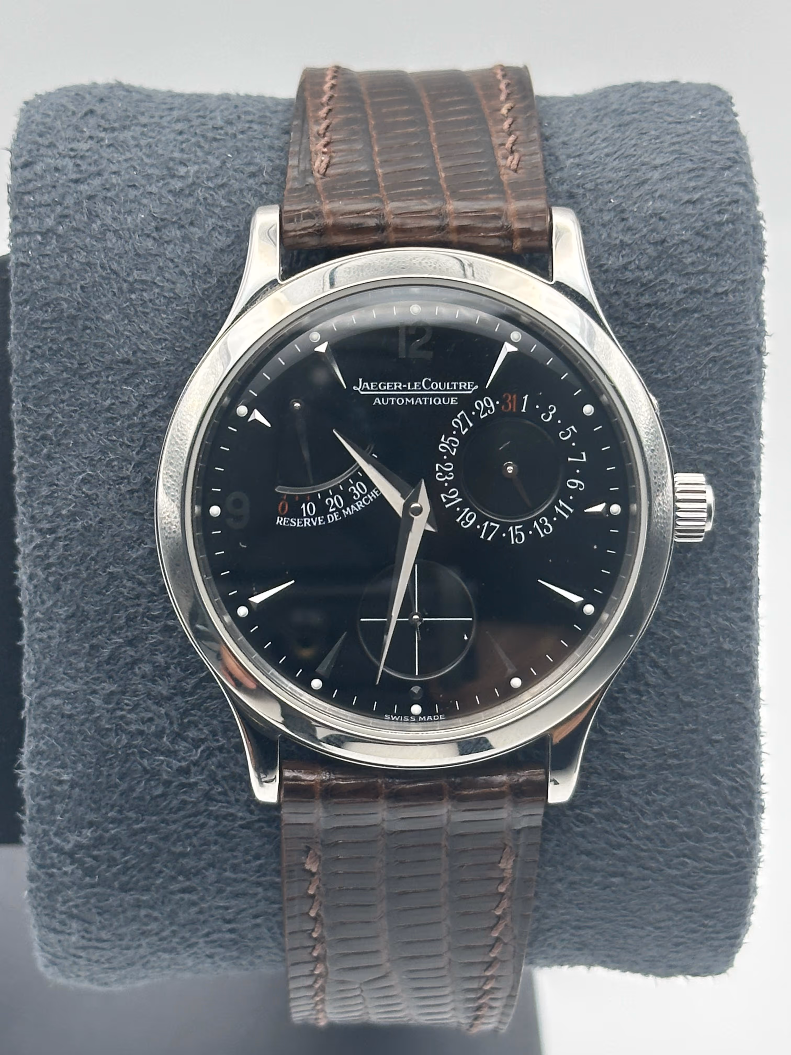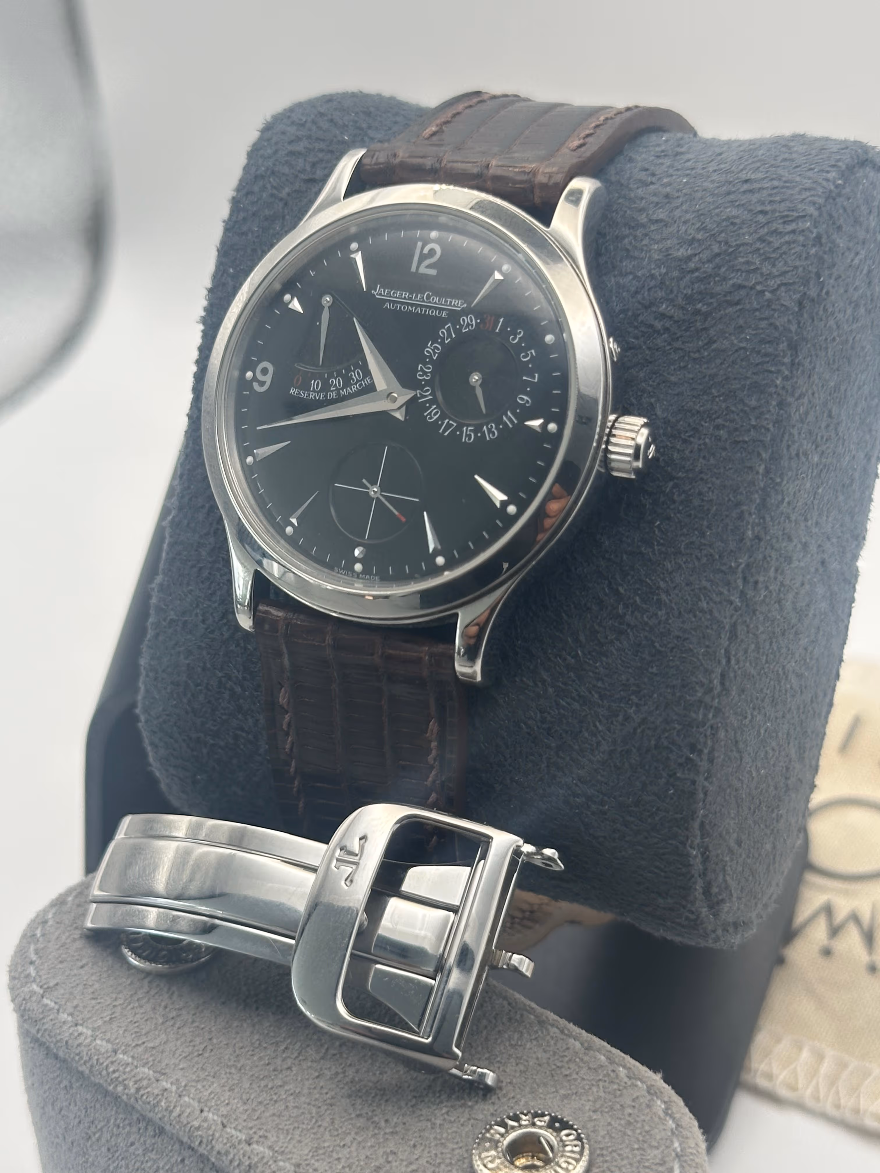 Élégante Jaeger-LeCoultre référence 140.8.93.S datant de 1999, cette Master Control Réserve de Marche incarne parfaitement le raffinement et l’exigence horlogère de la manufacture. Issue de la collection Master Control, reconnue pour ses standards de qualité rigoureux (tests de contrôle sur 1000 heures), elle se distingue par son cadran équilibré et sophistiqué intégrant un indicateur de réserve de marche, complication utile et emblématique qui permet de suivre l’autonomie du mouvement avec élégance. Son design épuré, associé à des finitions soignées et une excellente lisibilité, en fait une montre aussi pertinente au quotidien que dans un registre plus habillé. Elle est proposée avec un bracelet sur mesure de grande qualité, parfaitement adapté au boîtier, ainsi que sa boucle ardillon Jaeger-LeCoultre d’origine, apportant cohérence et valeur à l’ensemble. La montre est vendue seule, sans boîte ni papiers, et constitue une pièce de manufacture recherchée, alliant complication utile, sobriété et héritage horloger.