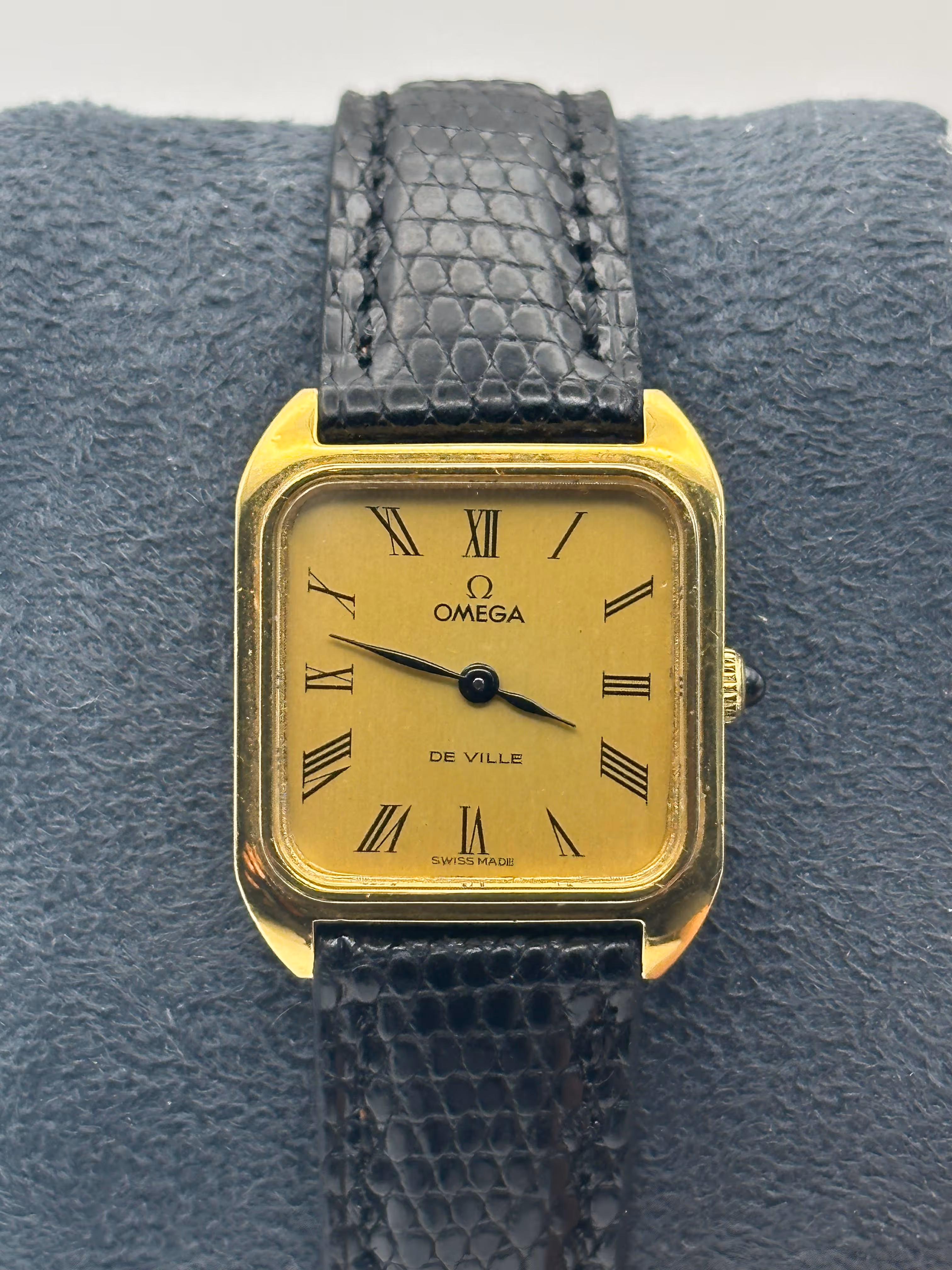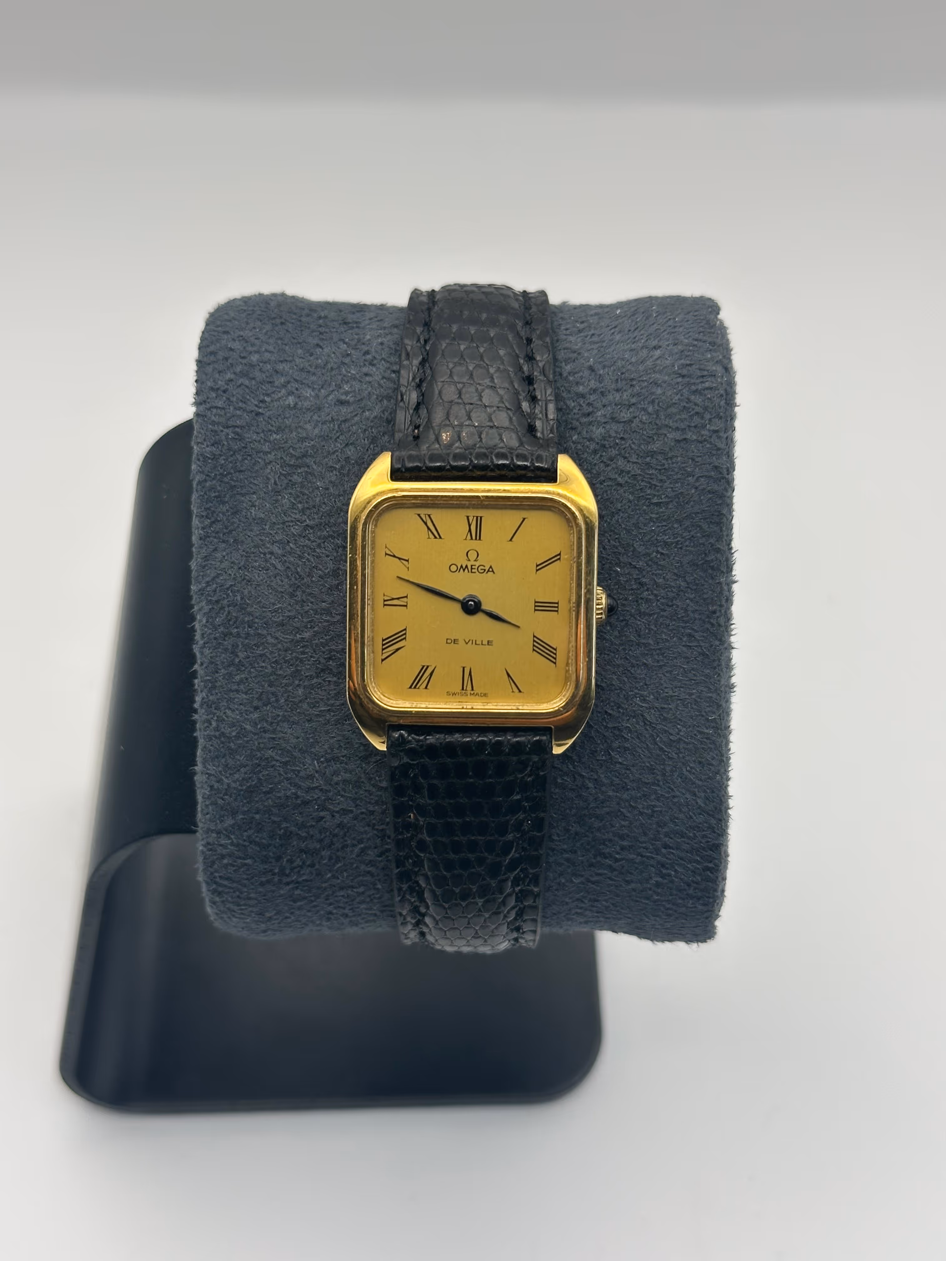 Élégante et résolument vintage, cette Omega De Ville séduit par son boîtier carré de 23 mm couleur or, offrant une silhouette à la fois discrète et raffinée. Son cadran champagne, sublimé par des chiffres romains, apporte une touche de chaleur et de sophistication tout en renforçant son esthétique classique et intemporelle. Animée par un mouvement à remontage manuel, elle incarne le charme des montres traditionnelles, où chaque geste participe à l’expérience. Elle est montée sur un bracelet sur mesure en lézard noir brillant, qui souligne son caractère distingué et complète harmonieusement cette pièce au style sobre et élégant.