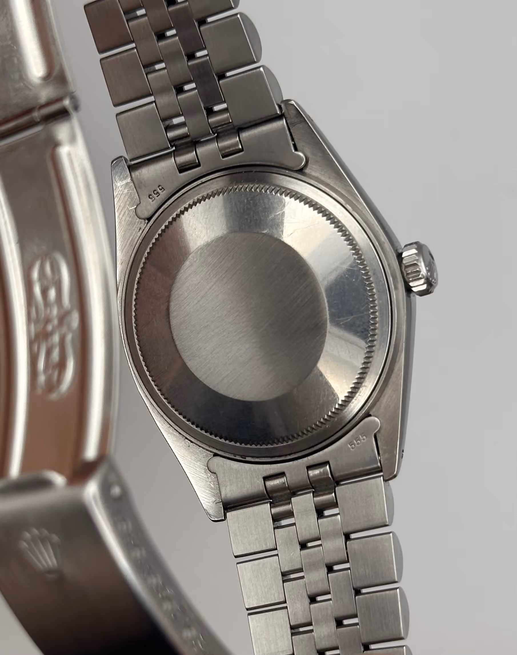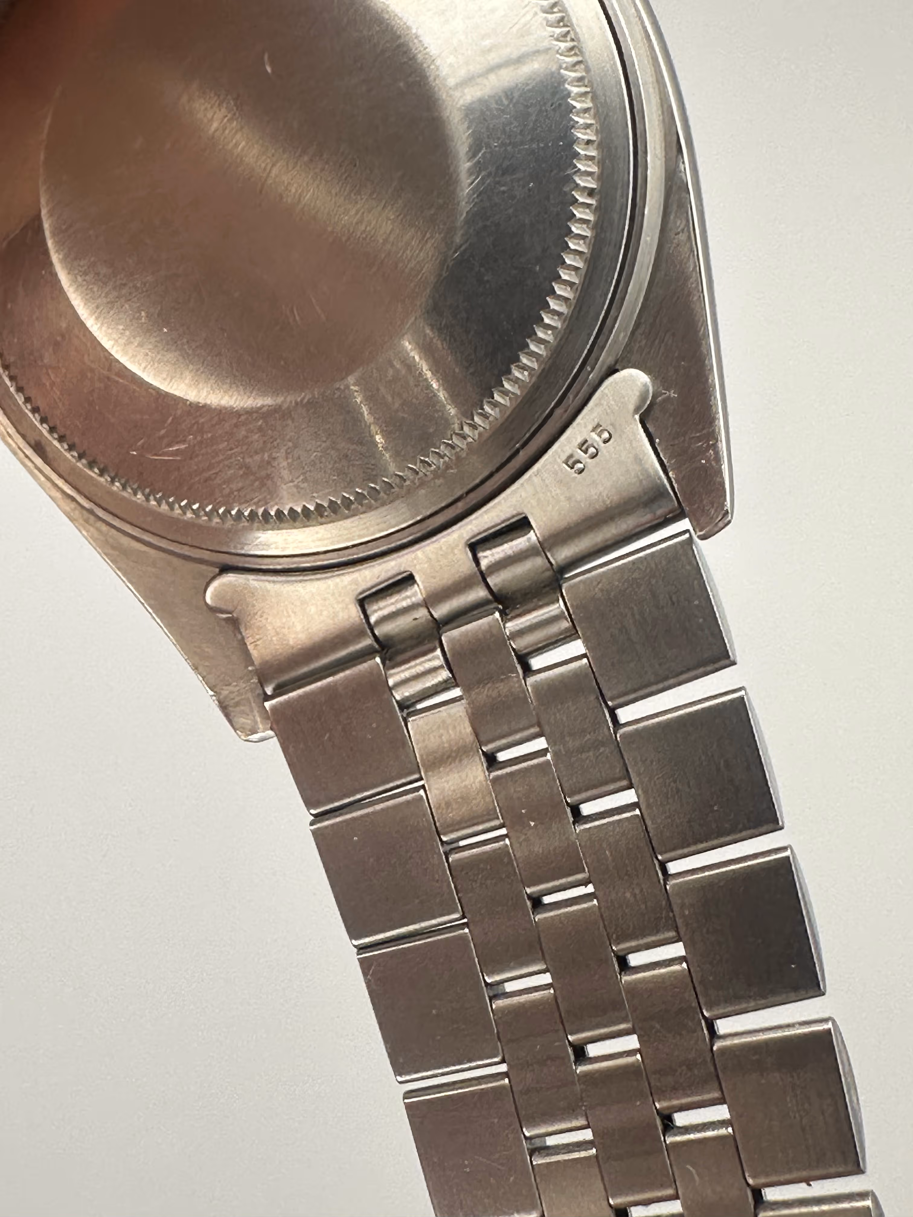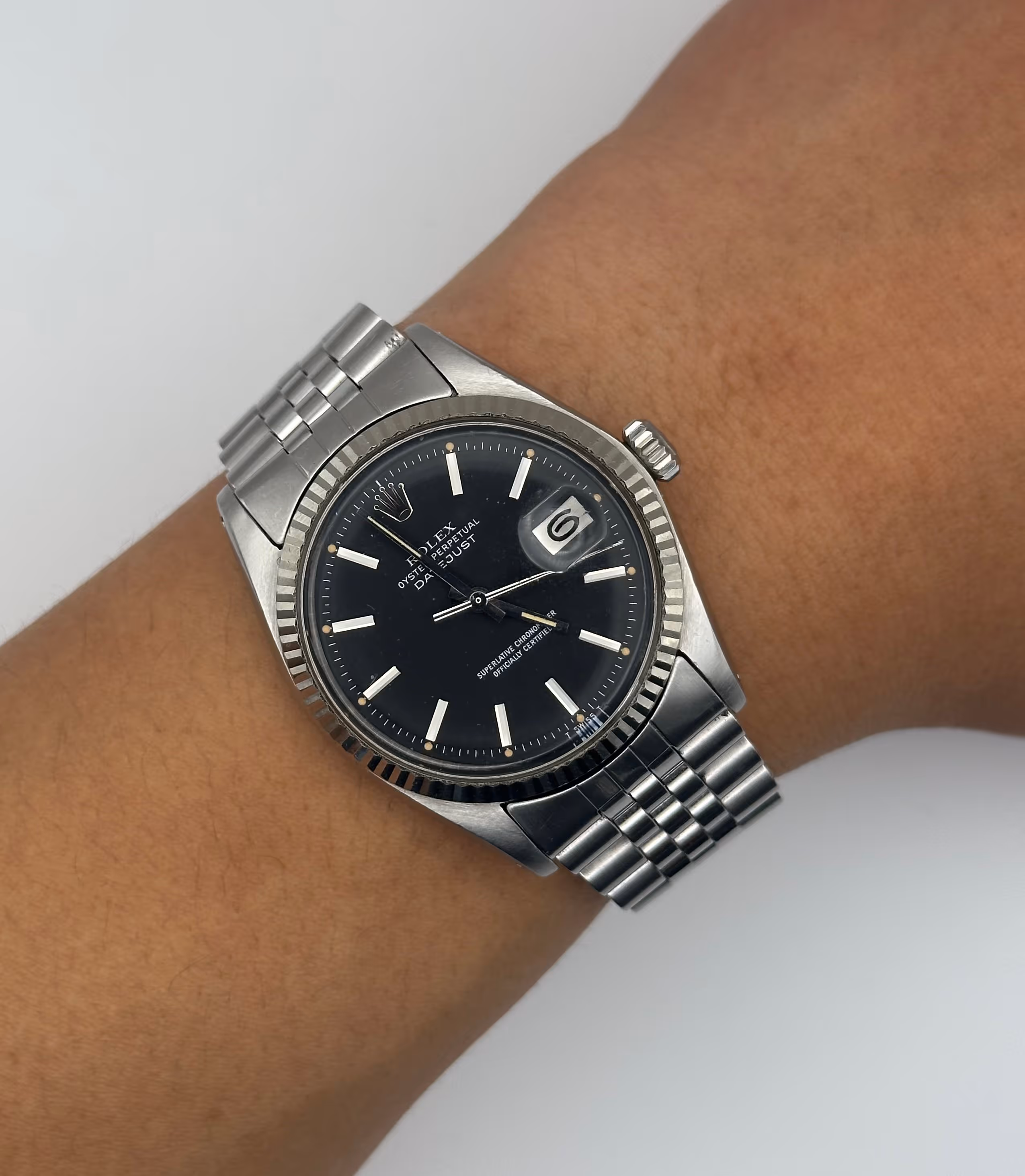 Rolex Datejust 1601 de 1975 en état remarquable, présentée avec un très recherché cadran noir d’origine signé T Swiss T, attestant de la présence de matière luminescente au tritium. Les index et plots tritium affichent une patine homogène et chaleureuse, parfaitement cohérente avec l’âge de la montre, renforçant son authenticité et son charme vintage. Le boîtier est en état parfait, aux lignes nettes et bien conservées, accompagné de sa lunette cannelée emblématique. Elle est montée sur son bracelet Jubilee d’origine, particulièrement appréciable car sans stretch, offrant un porté ferme et qualitatif. La montre a été révisée et fonctionne parfaitement. Un exemplaire très séduisant de la Rolex Datejust 1601, réunissant configuration recherchée, excellent état de conservation et belle cohérence générale. Vendue sans boîte ni papiers.