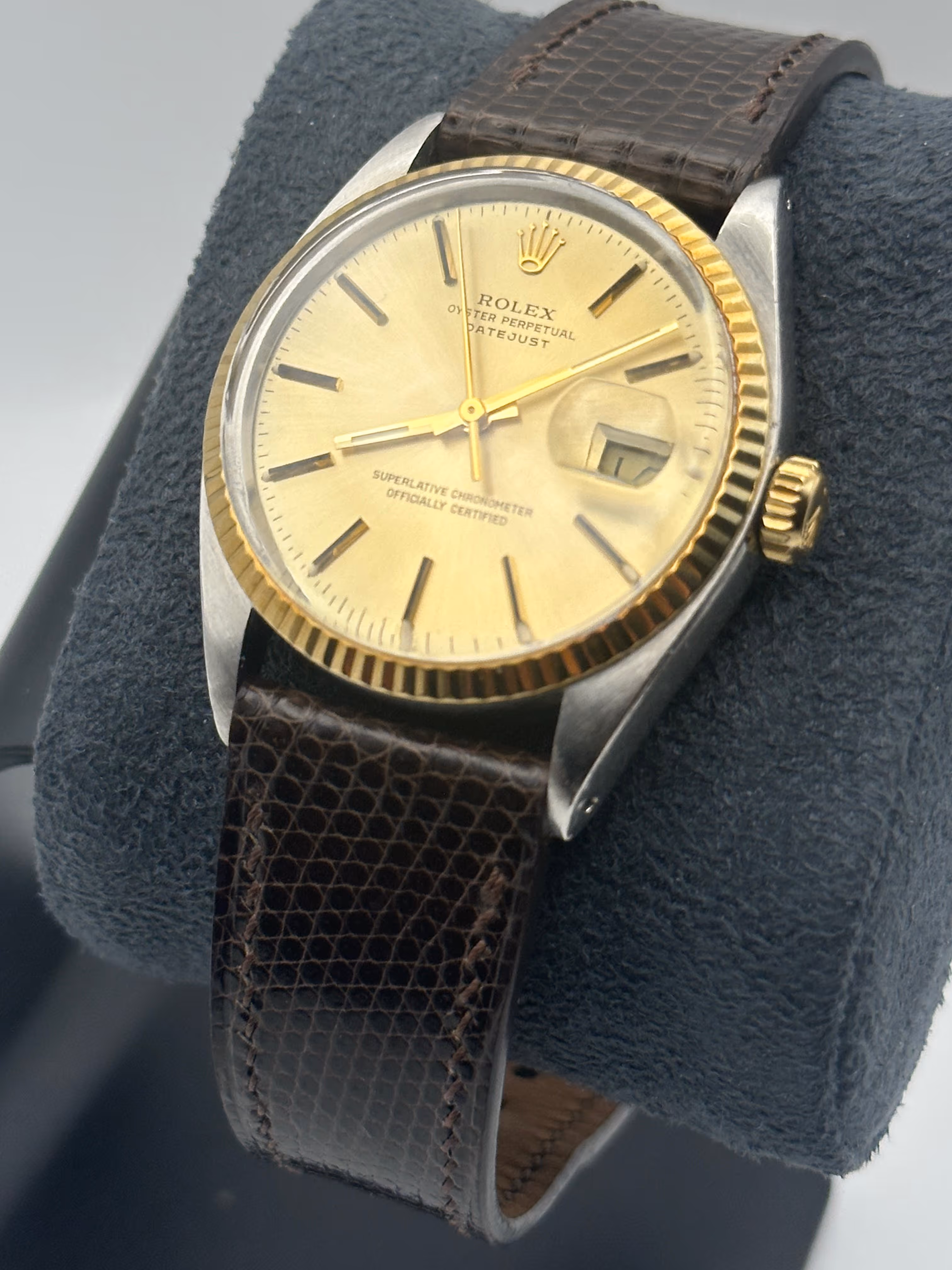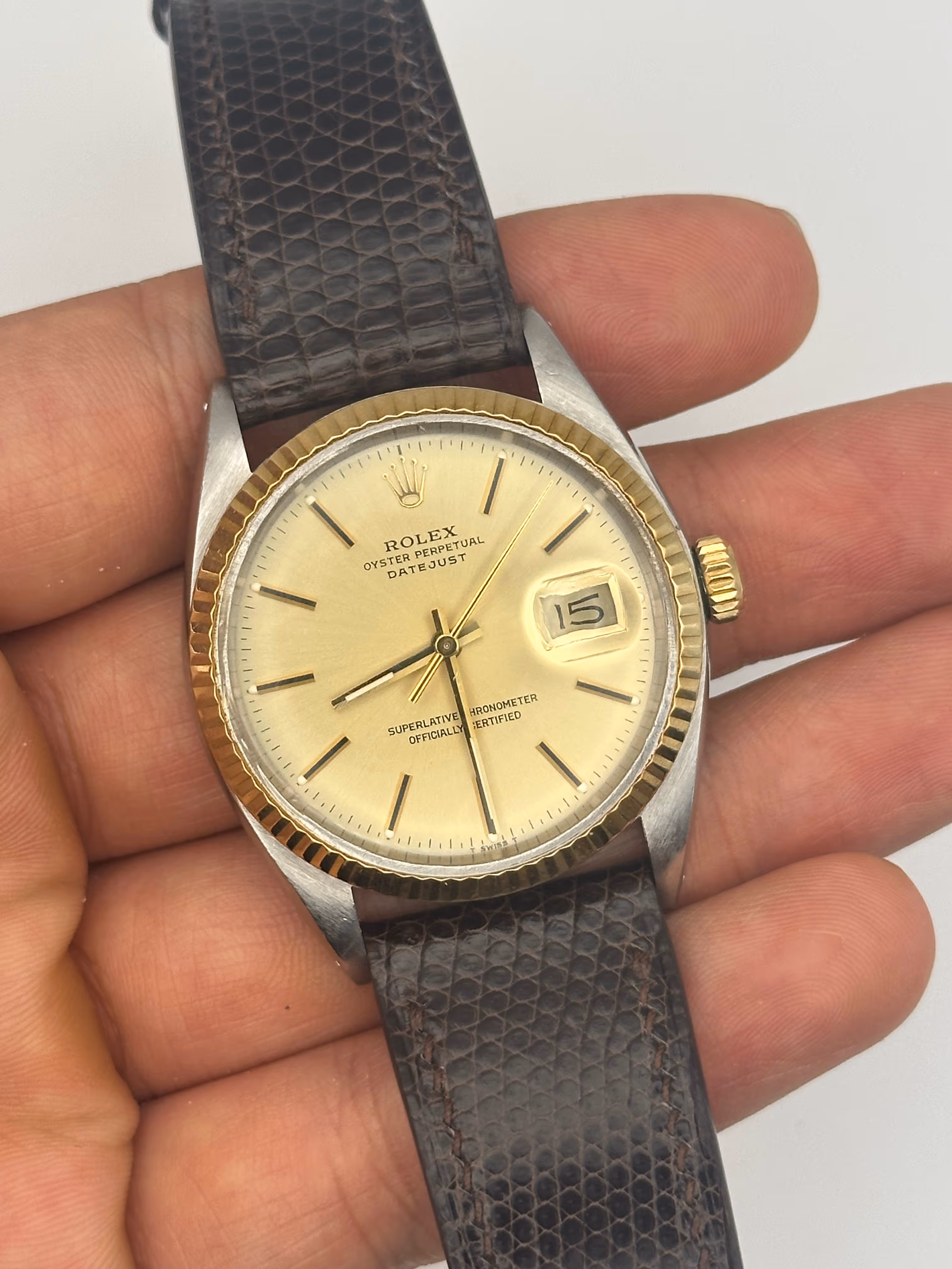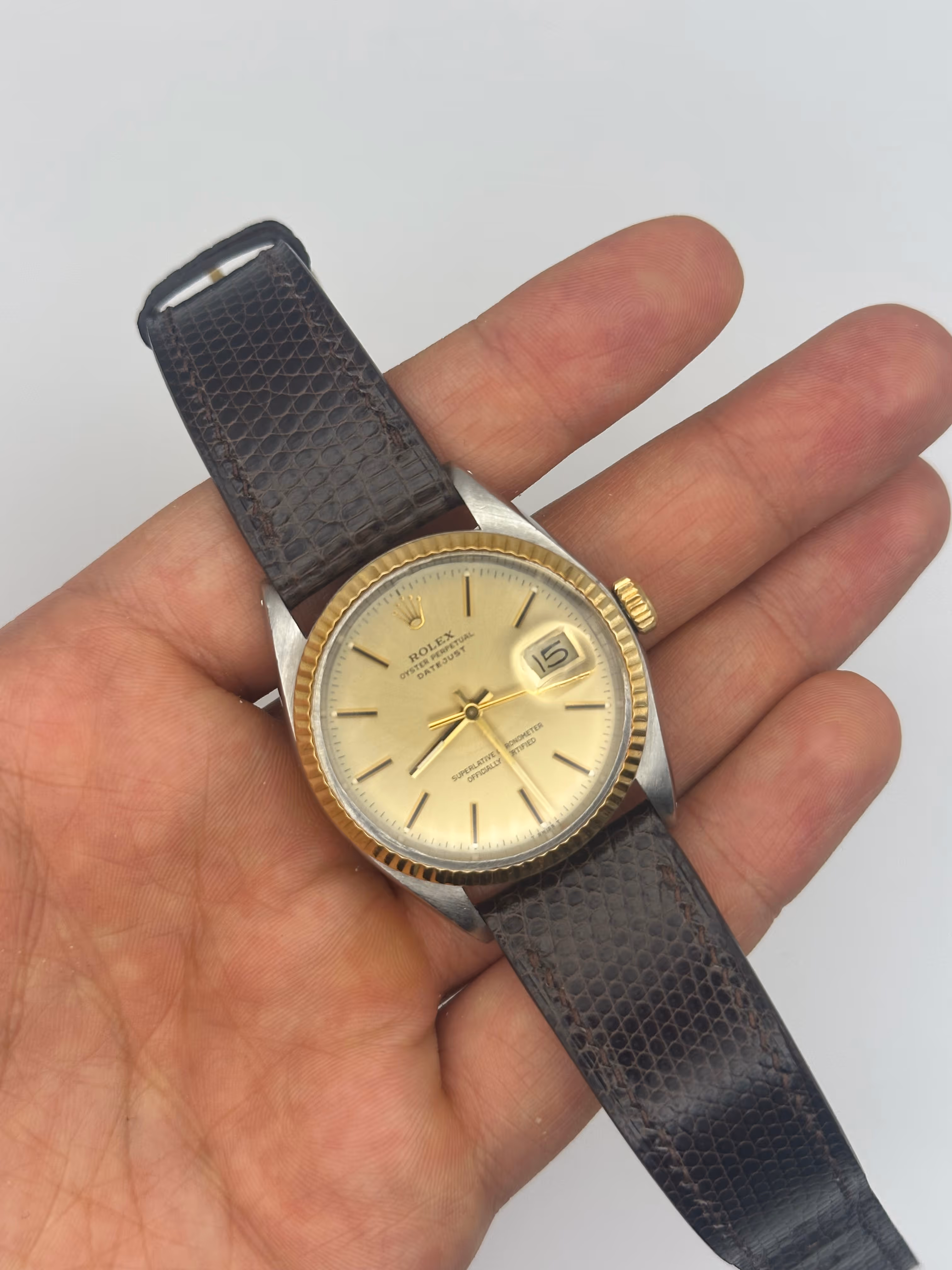 Magnifique Rolex Datejust 16013 en bi-ton de 1978. Cettre version a la fonction configuration de date rapide. La montre vient avec son bracelet Jubilée original ainsi qu'un bracelet en cuir lézard sur mesure. La montre tourne parfaitement.