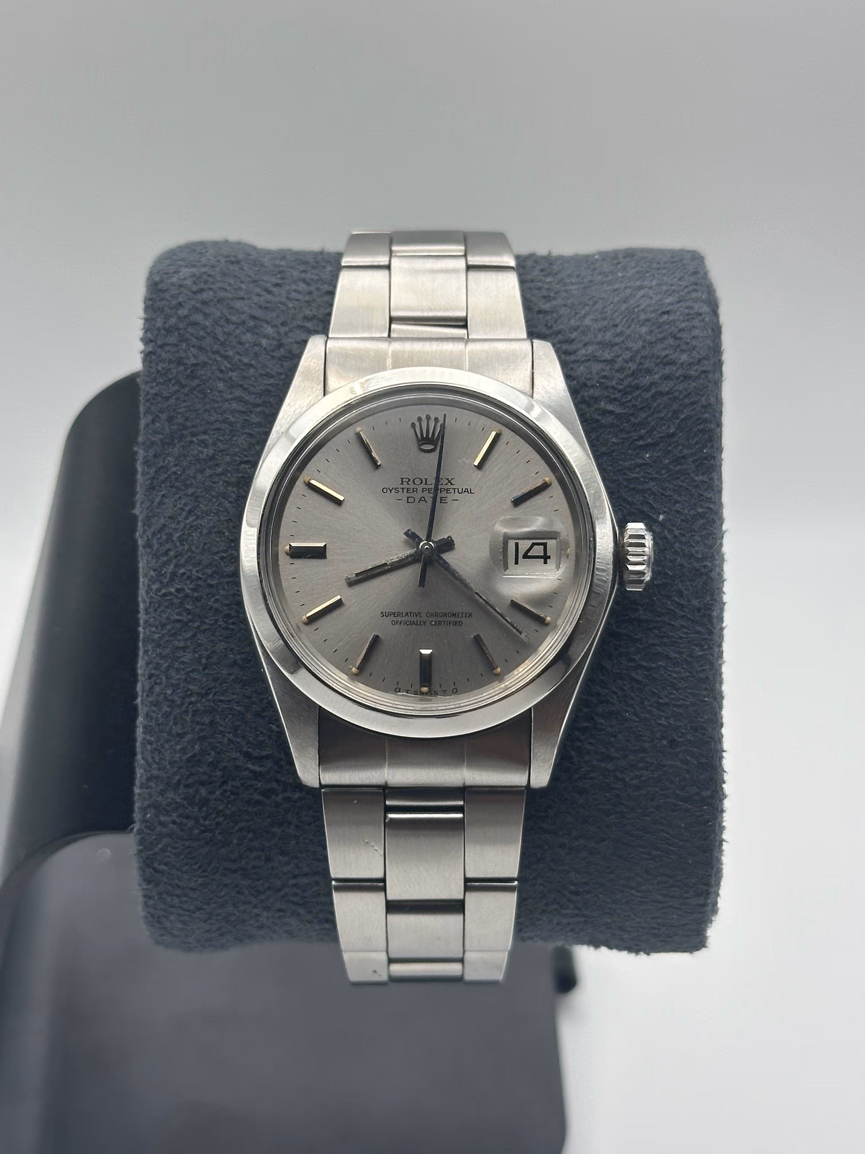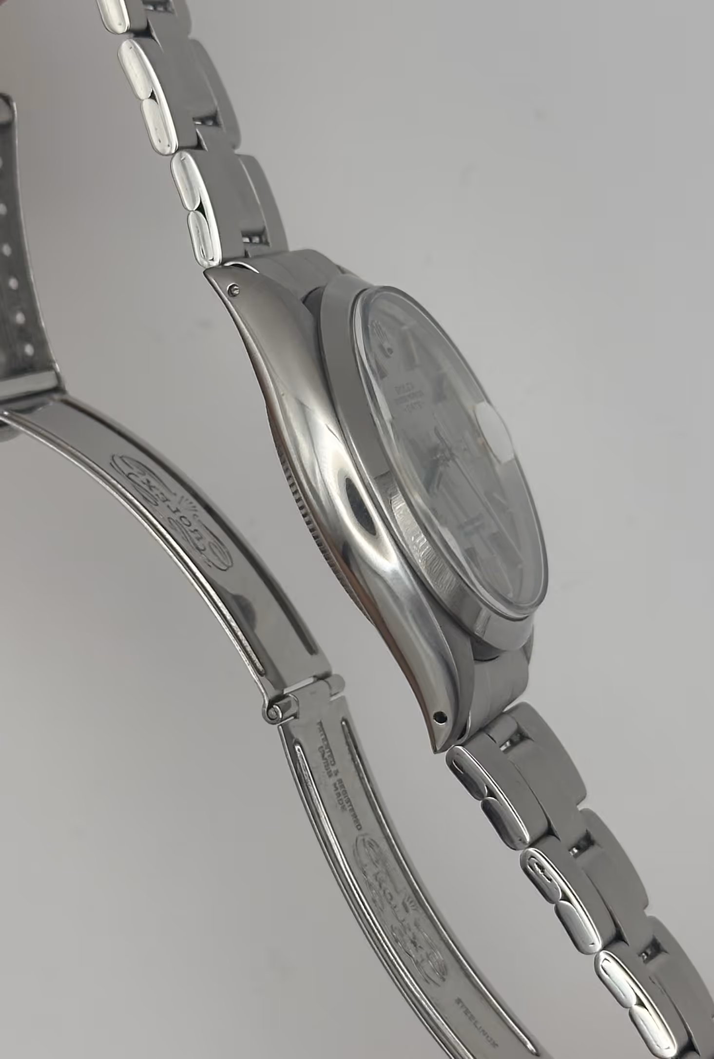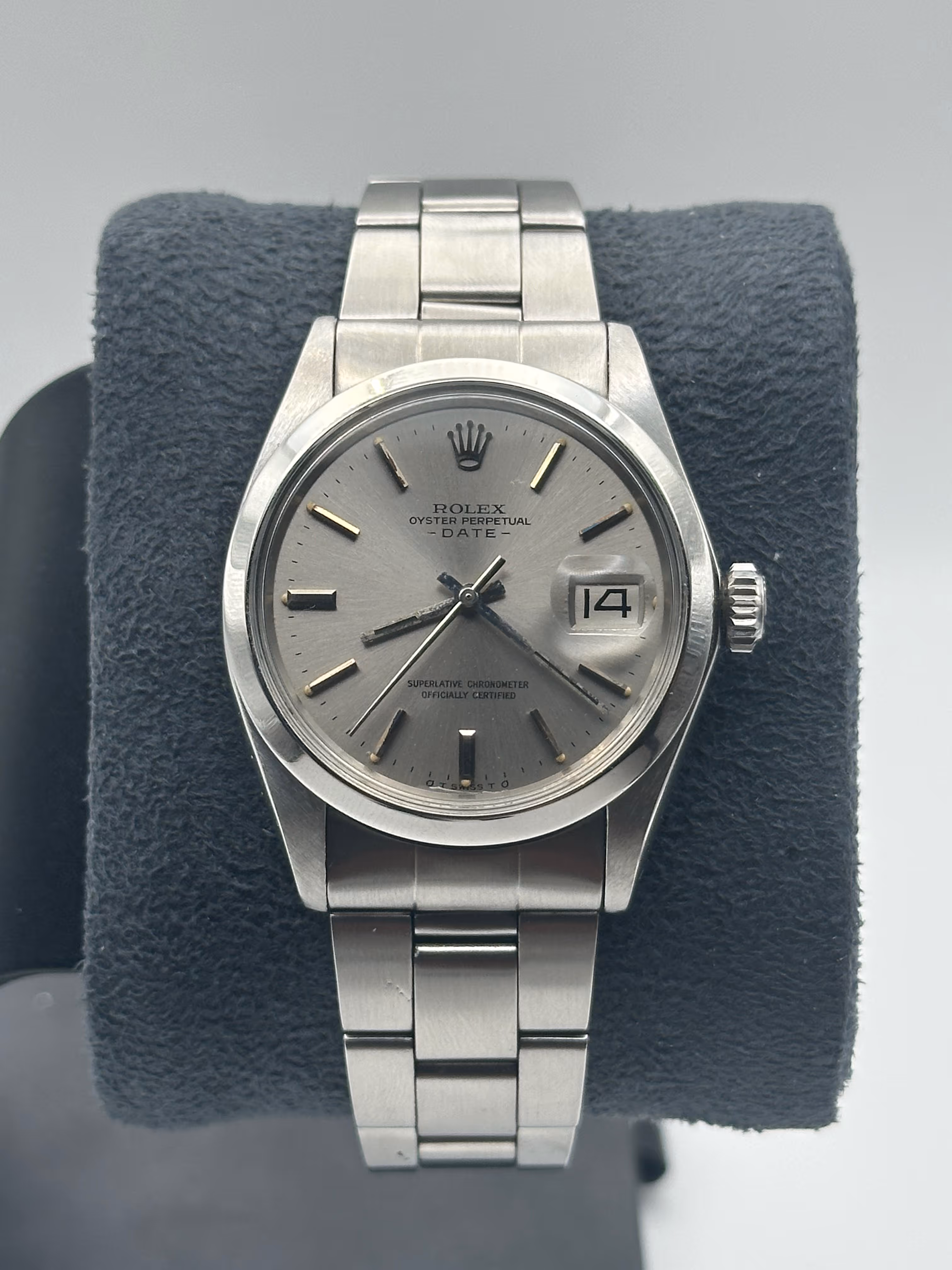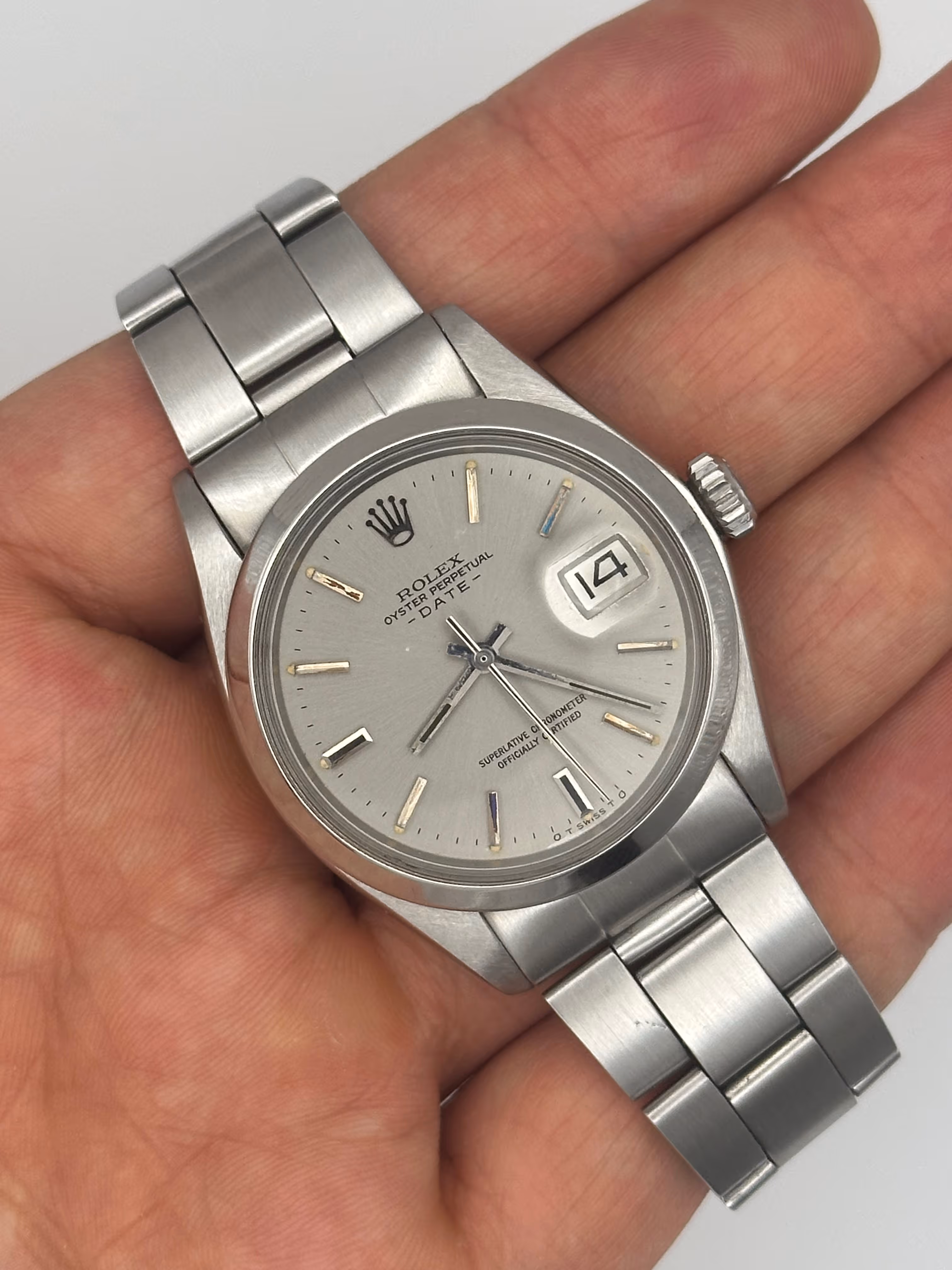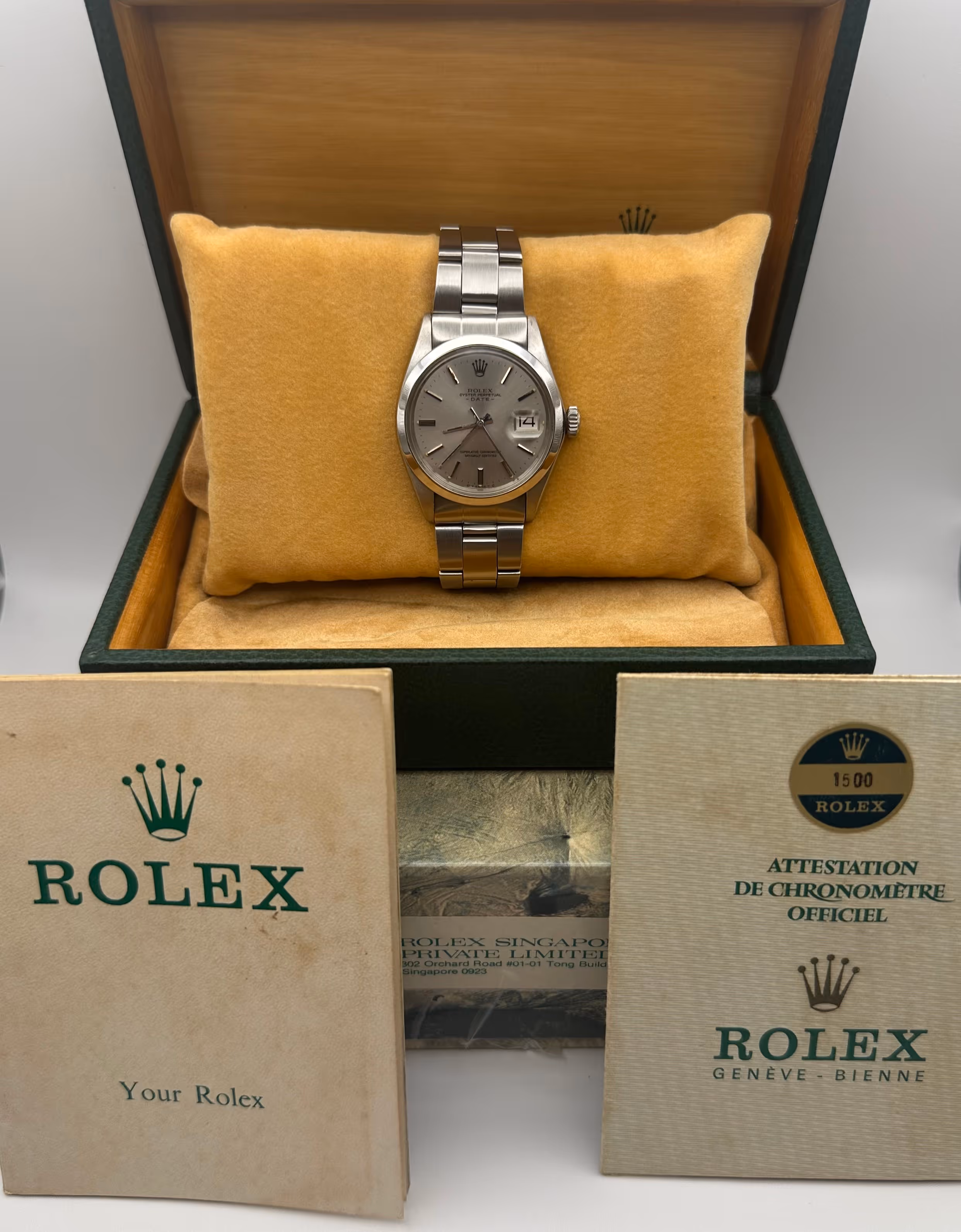 Très belle et extrêmement rare Rolex Oyster Perpetual Date ref. 1500 de 1974, proposée ici en full set avec sa boîte d’origine et surboîte, un ensemble particulièrement recherché par les collectionneurs. Cette pièce se distingue par son élégant cadran argent à signature sigma, attestant de la présence d’index appliqués en or blanc, accompagnés de plots tritium d’époque offrant une patine subtile et homogène. Son boîtier Oyster de 34 mm, aux proportions intemporelles, est complété par un bracelet Rolex d’origine en configuration full links, garantissant un ajustement optimal. Révisée en mars 2026, cette montre allie authenticité, fiabilité et charme vintage, représentant une opportunité rare d’acquérir un modèle emblématique dans un état et une configuration aussi complets.