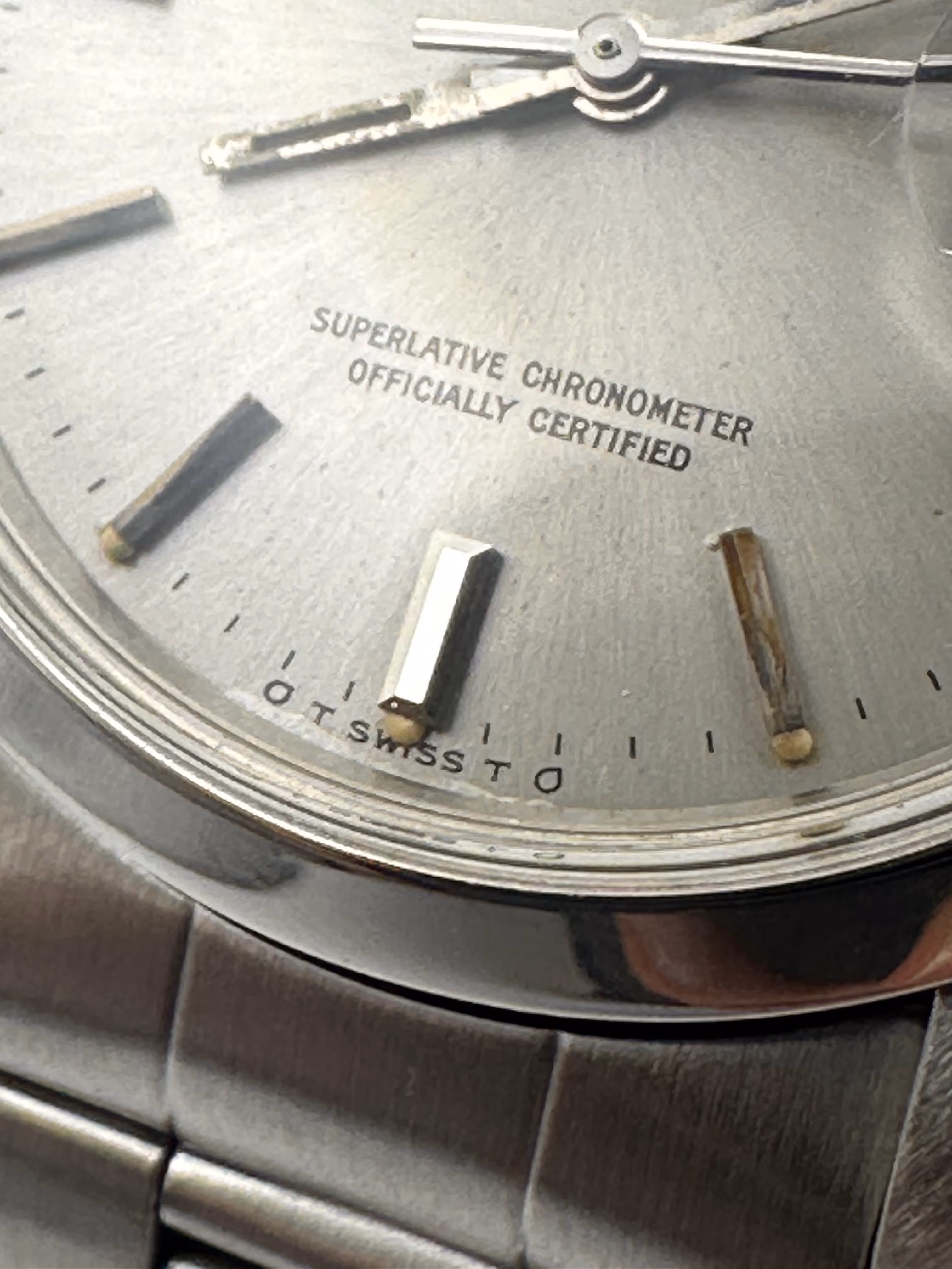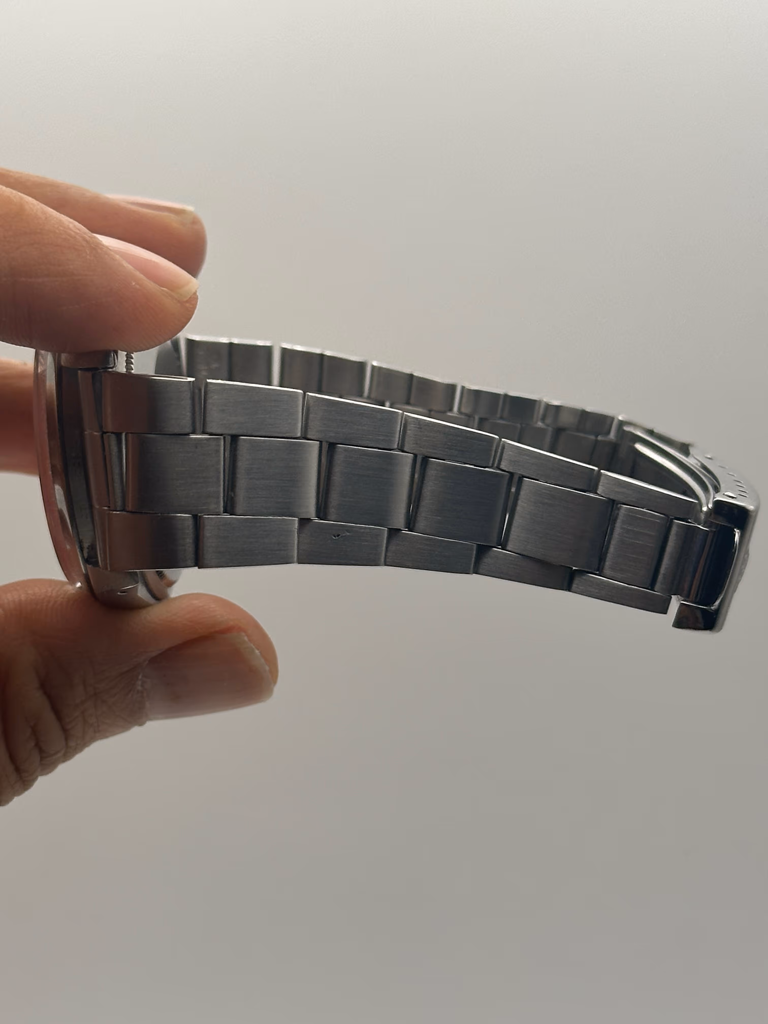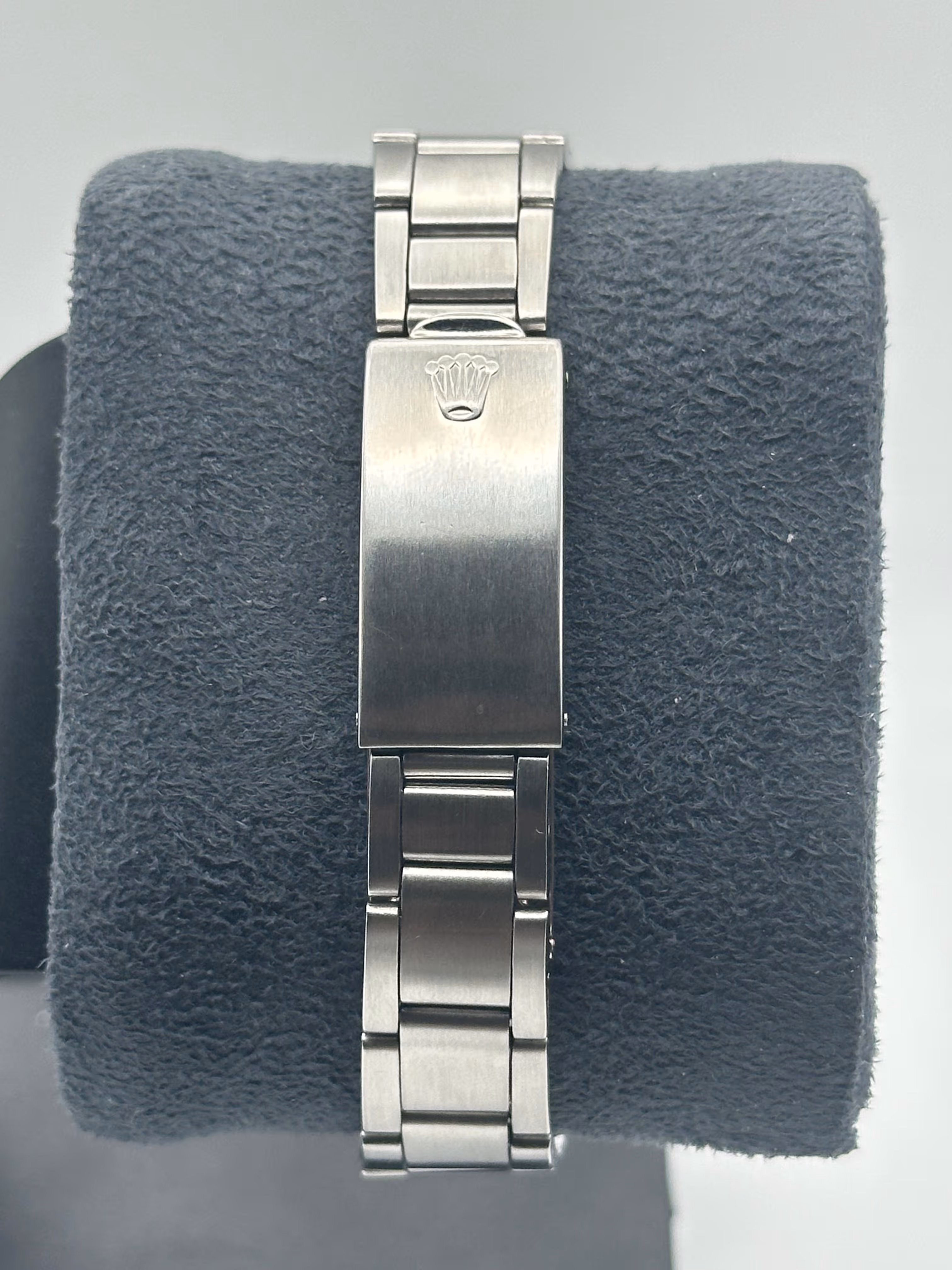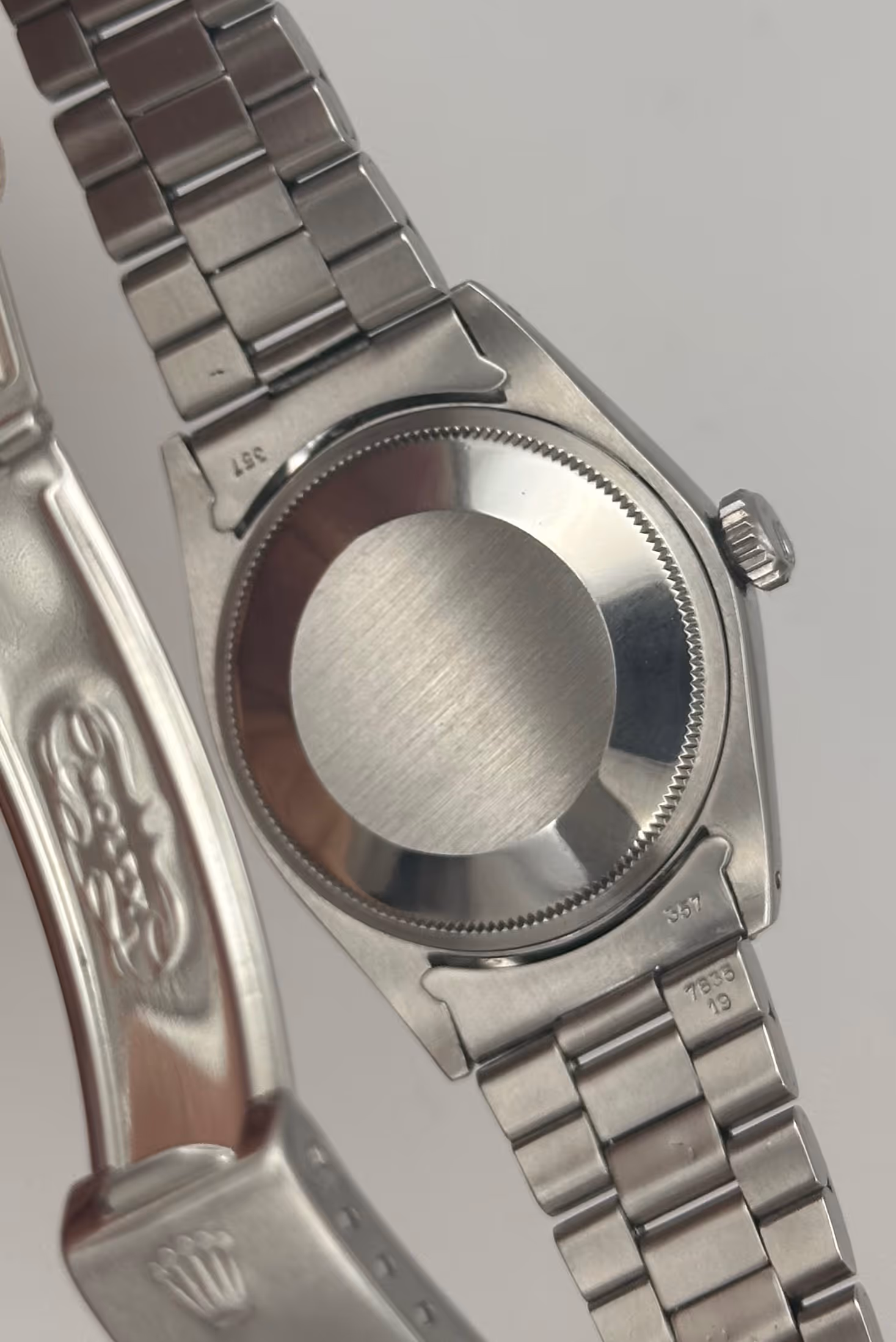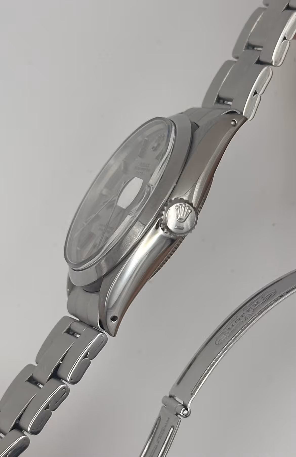 Très belle et extrêmement rare Rolex Oyster Perpetual Date ref. 1500 de 1974, proposée ici en full set avec sa boîte d’origine et surboîte, un ensemble particulièrement recherché par les collectionneurs. Cette pièce se distingue par son élégant cadran argent à signature sigma, attestant de la présence d’index appliqués en or blanc, accompagnés de plots tritium d’époque offrant une patine subtile et homogène. Son boîtier Oyster de 34 mm, aux proportions intemporelles, est complété par un bracelet Rolex d’origine en configuration full links, garantissant un ajustement optimal. Révisée en mars 2026, cette montre allie authenticité, fiabilité et charme vintage, représentant une opportunité rare d’acquérir un modèle emblématique dans un état et une configuration aussi complets.